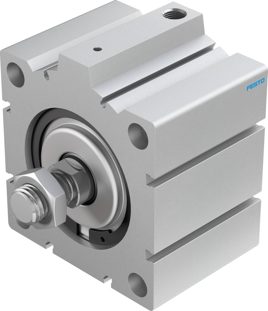 Short-stroke cylinder AEVC-100-25-A-P-A For proximity sensing, piston-rod end with male thread. Stroke=25 mm, Piston diameter=100 mm, Spring return force, retracted=140 N, Based on the standard=(* ISO 6431, * Hole pattern, * VDMA 24562), Cushioning=P: Flexible cushioning rings/plates at both ends